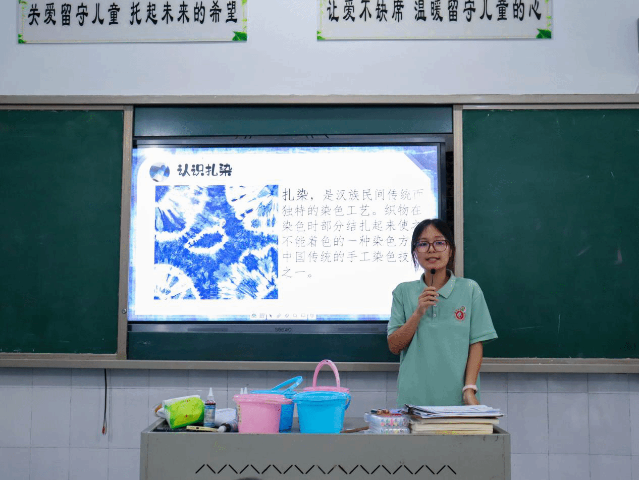 实践团成员刘欣以图文并茂的方式,带领孩子们穿越历史长河,领略扎染这一瑰宝的魅力。她从技艺的悠久传承,到捆扎、夹扎的力道技巧,再到色彩搭配的奥秘,深入浅出地解析了扎染艺术的独特美感。“同学们,相同的扎法也会因松紧不同,呈现出独一无二的图案哦!橡皮筋扎得越紧,留白就越多,你们每个人的作品都将是独一无二的!”刘欣一边强调着扎染的个性化魅力,一边从“扎”与“染”两大核心环节入手,细致讲解染色技巧,并现场示范:折叠、捆扎、固定,动作流畅而专注。
