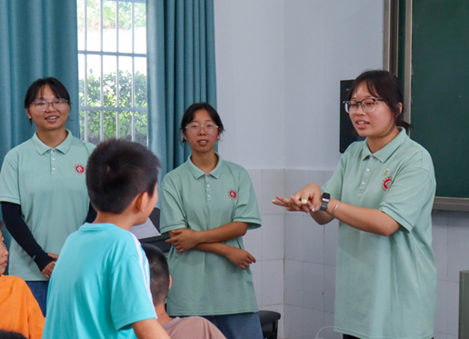 情景模拟学自护,防溺水知识入心入脑。在防溺水宣传环节,实践团成员唐媛结合生动的PPT课件,用通俗易懂的语言,详细讲解了如何预防溺水、识别溺水迹象,并重点通过情景模拟演示了溺水自救与互救的正确方法,让孩子们在实践中掌握安全技能。“遇到同伴溺水,千万不能盲目下水施救!要第一时间大声呼救,并寻找长竹竿、救生圈等工