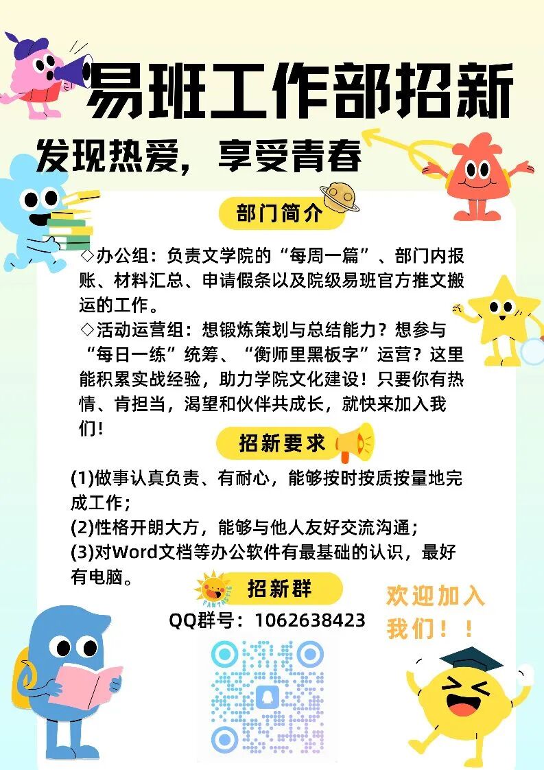 2、活动运营组:想锻炼策划与总结能力?想参与“每日一练”统筹、“衡师里黑板字”运营?这里能积累实战经验,助力公司文化建设!只要你有热情、肯担当,渴望和伙伴共成长,就快来加入我们!