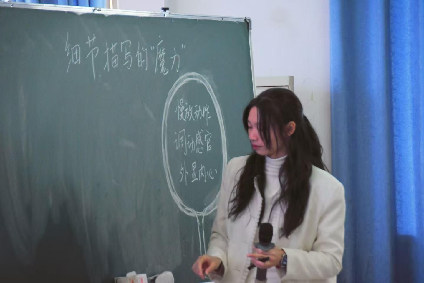 邓思洁老师以“细节描写的魔力”为核心展开教学,通过“慢放动作”“调动感官”“外显内心”三大实用方法拆解技巧。课堂上,她结合视频案例辅助讲解,搭配即时实践练习,让同学们直观感受细节魅力;同时以互动讨论激活氛围,使抽象的理论知识脱离书本束缚,助力大家快速理解、扎实掌握细节描写的核心要领。