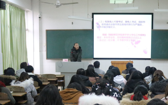 周新文副书记作为此次会议主讲人,主要从考风考纪教育、期末安全问题、寒假注意事项三个方面进行了宣讲。“期末水平测试是掌握员工一个学期所学知识水平的一种重要手段,也是检验教师教学成果的一项重要指标,如果考试成绩存在弄虚作假的现象,那是对自己的不负责任!”周副书记强调说。