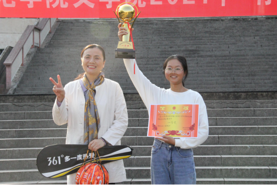 (王天龙老师与汉语言文学五班周紫洋代表合影)