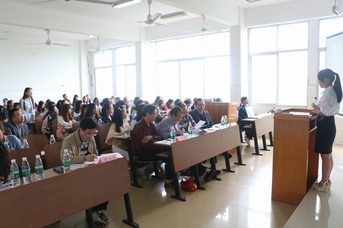 比赛开始前,12位选手依次抽取参赛题目。比赛共分为三个环节:第一个环节是制作ppt和word文档教案,限时60分钟,比赛地点设在文D206实验室;第二个环节是教育问答, 限时5分钟,比赛地点设在文D410教室;第三个环节是模拟授课,采用片段教学模式,限时10分钟,比赛地点设在文D410教室。整个比赛过程紧张有序,现场气氛热烈,特别是模拟授课环节,台上选手表现精彩,高潮迭起,台下观众自觉投入,积极配合,双方和谐默契,呈现了一场精彩赛况。